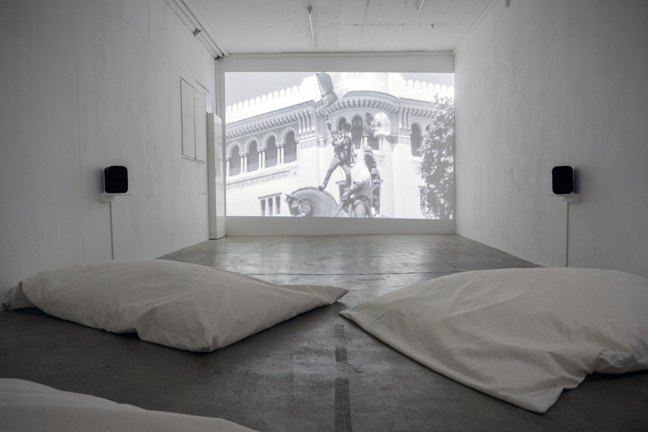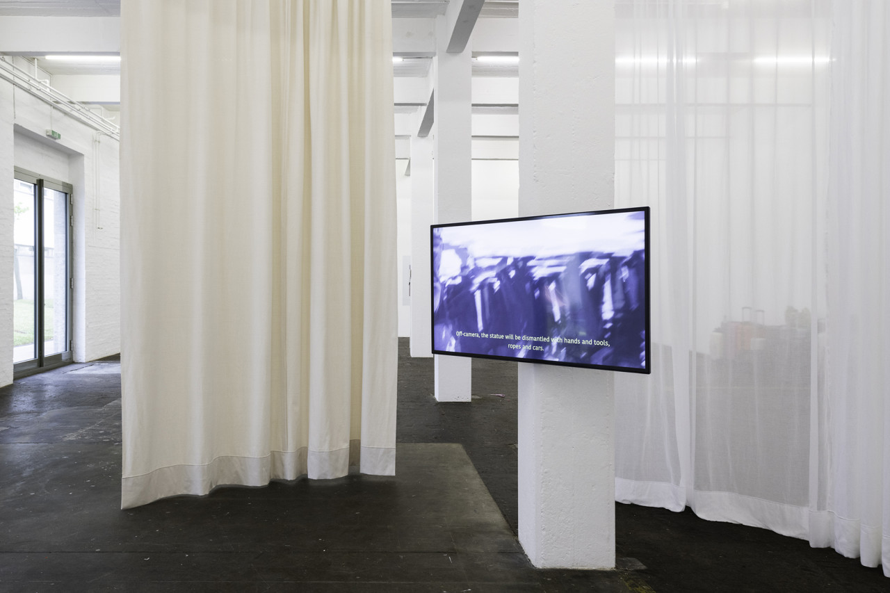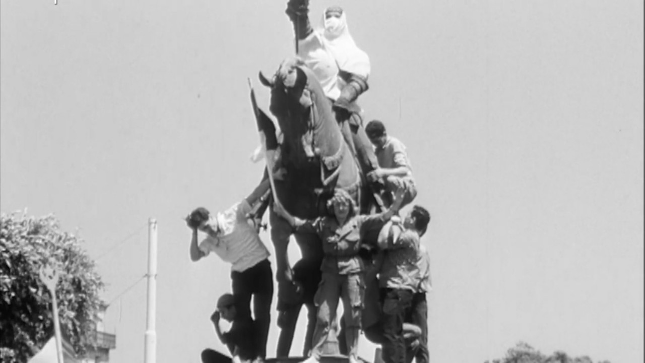 L’essai vidéo off-camera traite d’un film d’archive tourné par l’armée française le jour de la déclaration d’indépendance de l’Algérie, le 5 juillet 1962. Conservée au sein des archives audiovisuelles de la Défense, la courte séquence montre une foule qui célèbre autour d’une statue de Jeanne d’Arc au centre-ville d’Alger. Dans un acte symbolique de résistance à l’occupation coloniale française, la figure est recouverte d’un haïk et son épée est remplacée par un drapeau algérien. En se focalisant sur le hors champ de la caméra, la vidéo articule un récit qui témoigne des moments intermédiaires, éclairant les processus de transitions historiques, leurs traces tangibles et intangibles. Elle attire l’attention sur les conditions de la création d’archives qui échappent à la visibilité immédiate, remplaçant la présentation de l’histoire comme une quantité fixe par la notion d’une historiographie produite à partir du point de vue du présent.
