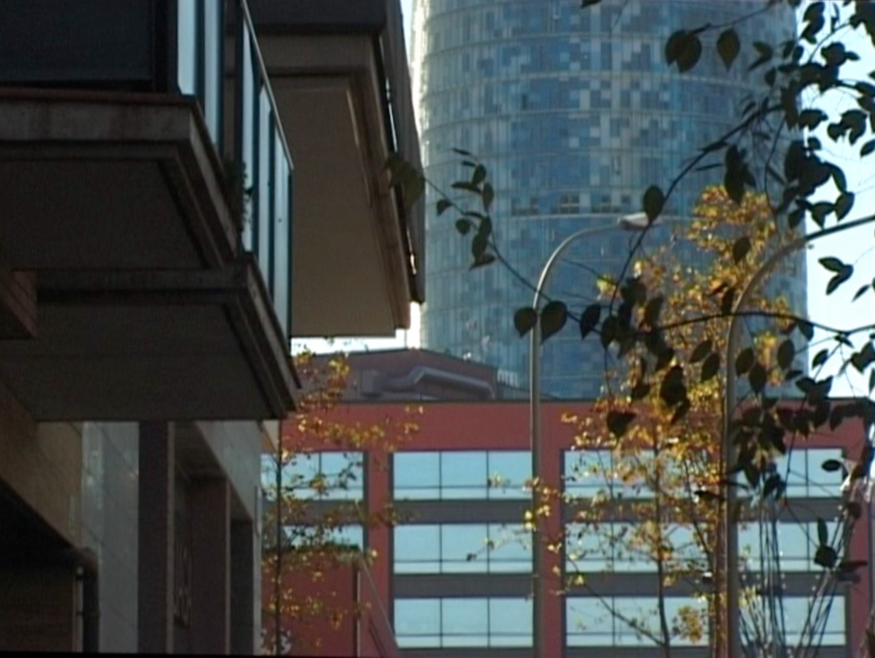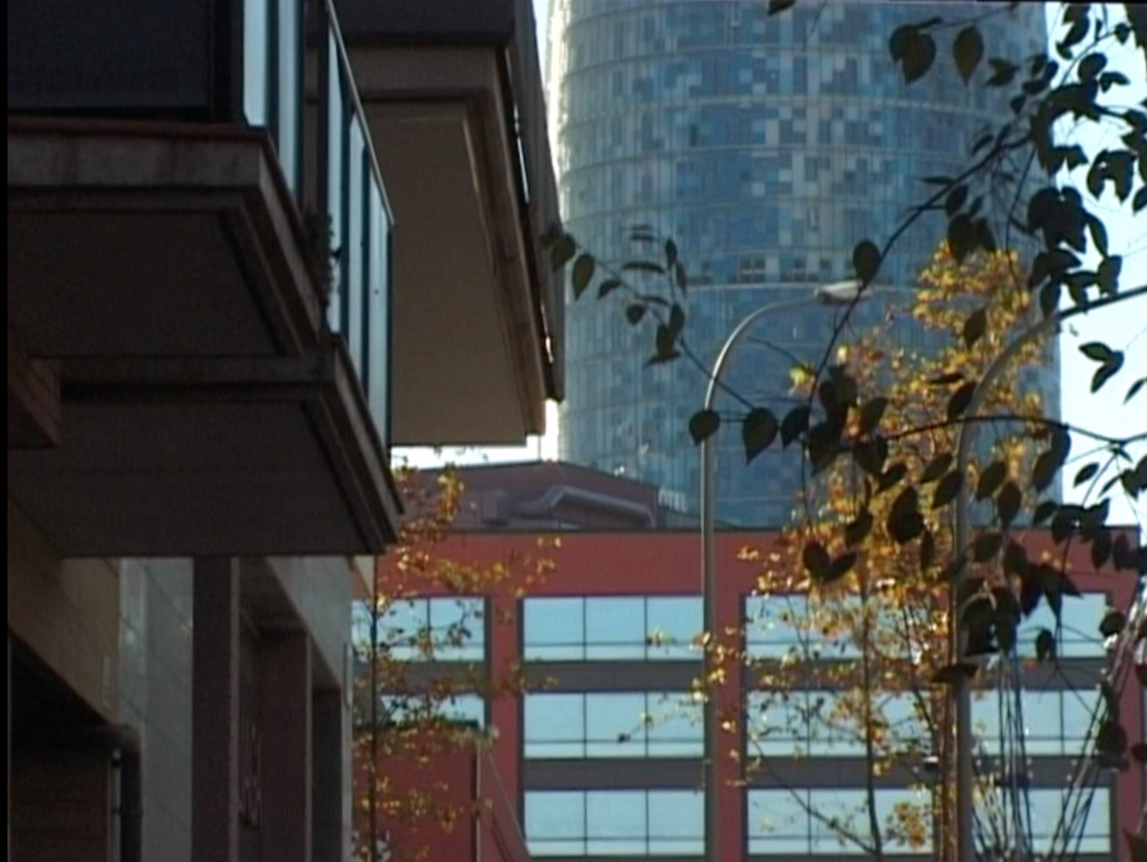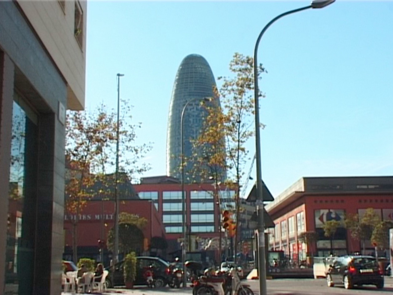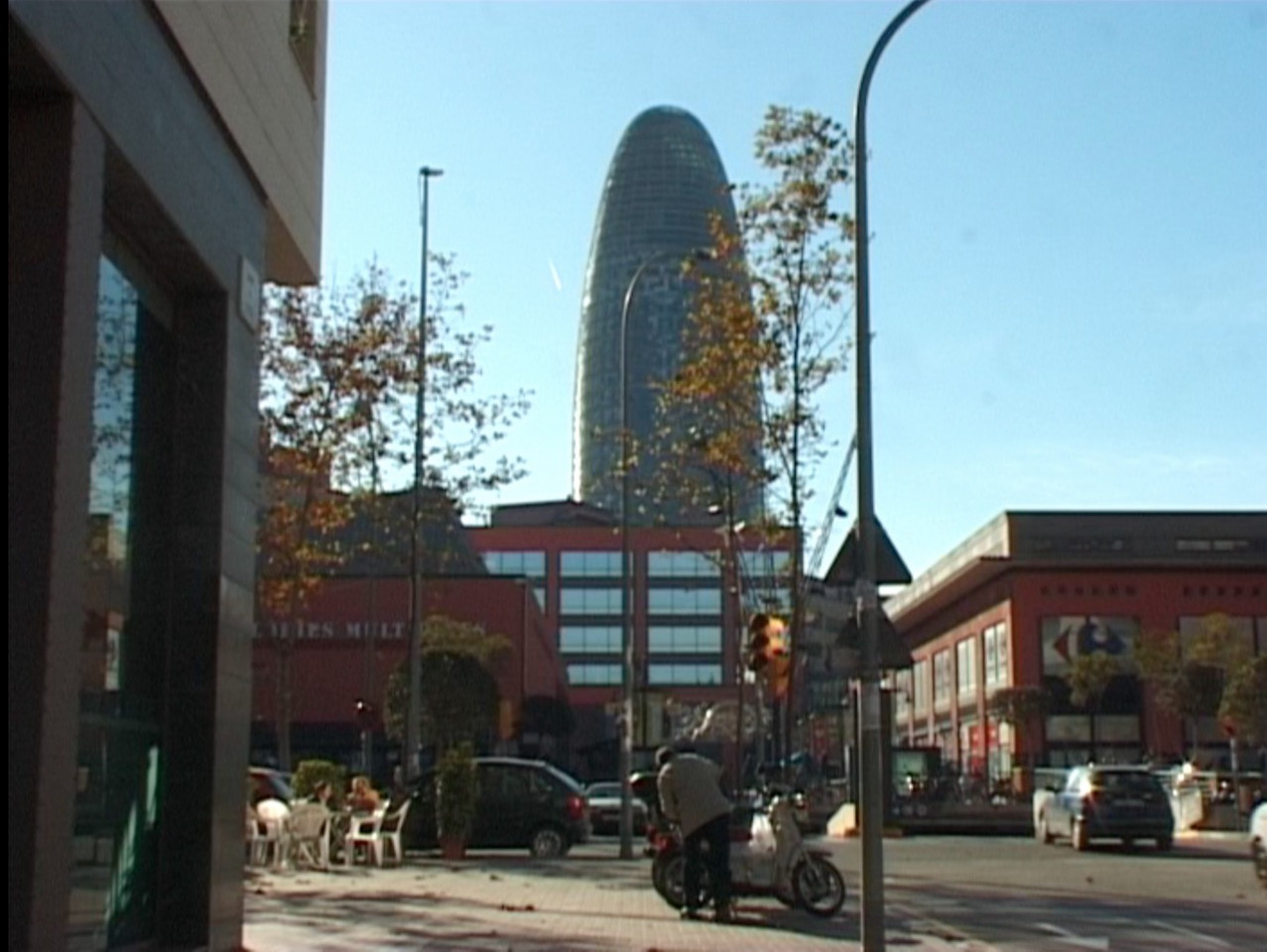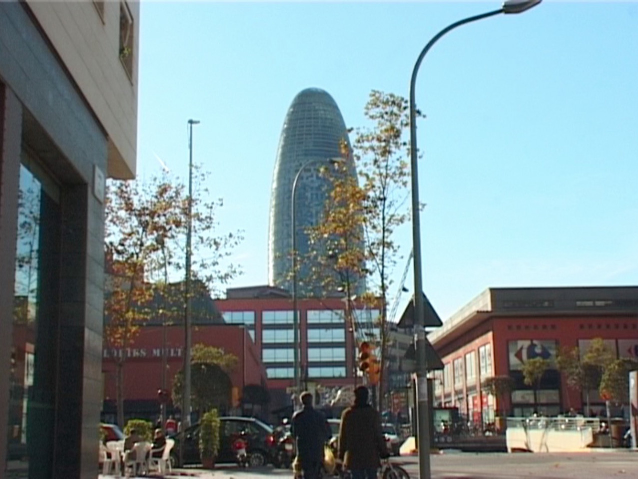 C’est l’histoire en trois récits de la Torre Agbar que Jean Nouvel a conçue à Barcelone. Ce bâtiment de 144 mètres, inauguré début 2004, se dresse en un cylindre protubérant de base ovale avec une façade circulaire de verre et de métal. Que dire d’une telle emprise sur le paysage urbain, qu’en montrer pour en prendre la mesure? Le parti pris de Véronique Goël est radical et minimaliste. Elle décide d’en pro- poser quatre plans fixes qui réduisent sa prestance en la fondant dans l’épaisseur du tissu urbain. Ces images d’une Tour empêtrée plutôt qu’élancée sont d’une durée suffisante pour que le regard les détaille à sa guise et perçoive la parfaite banalité du quotidien duquel se détache massivement cette architecture.