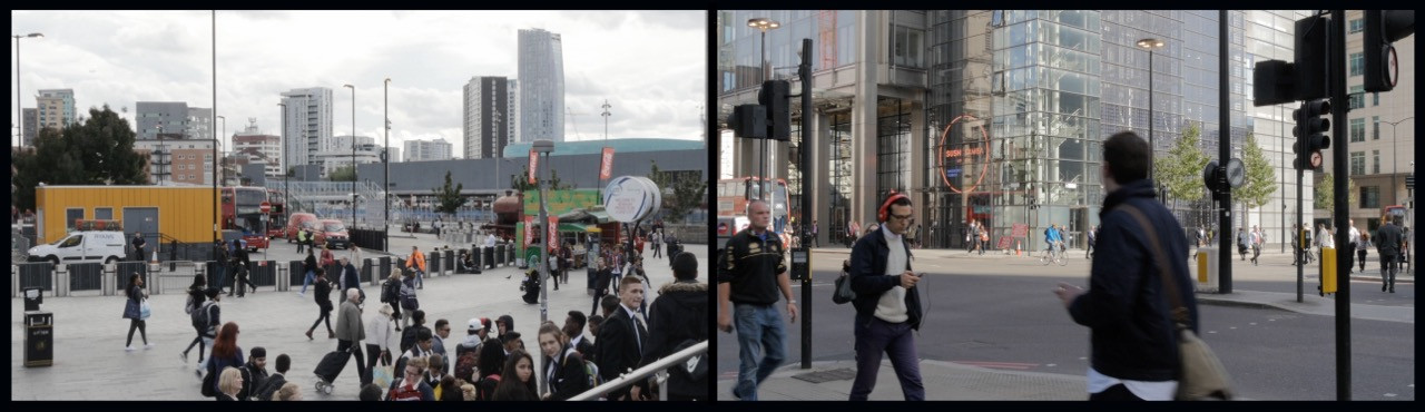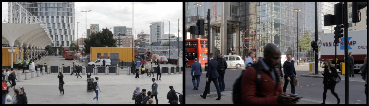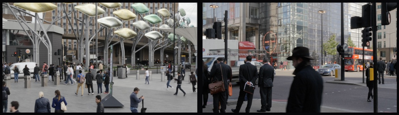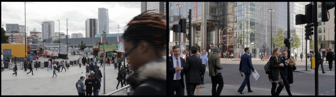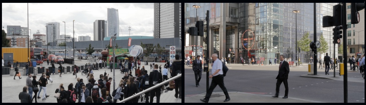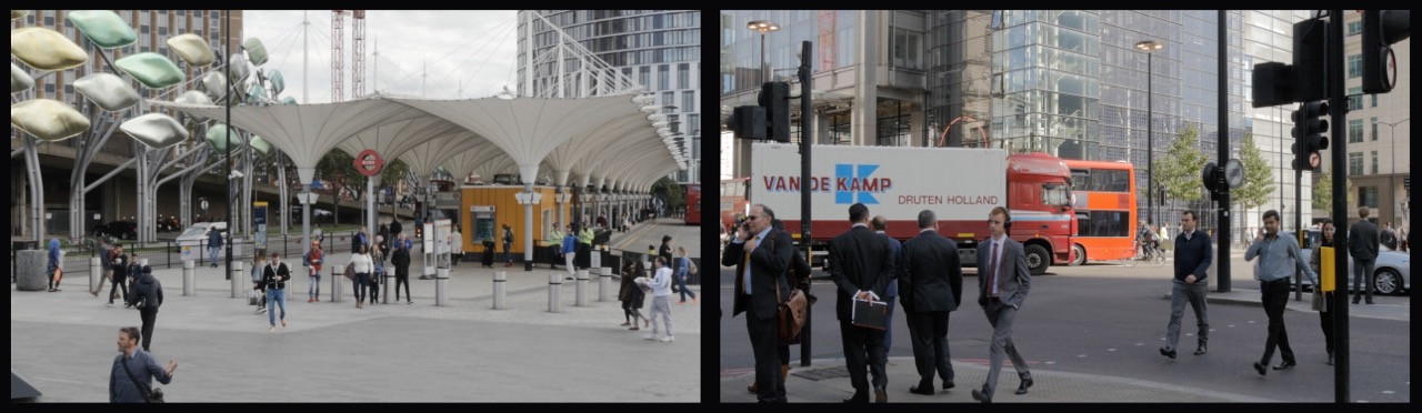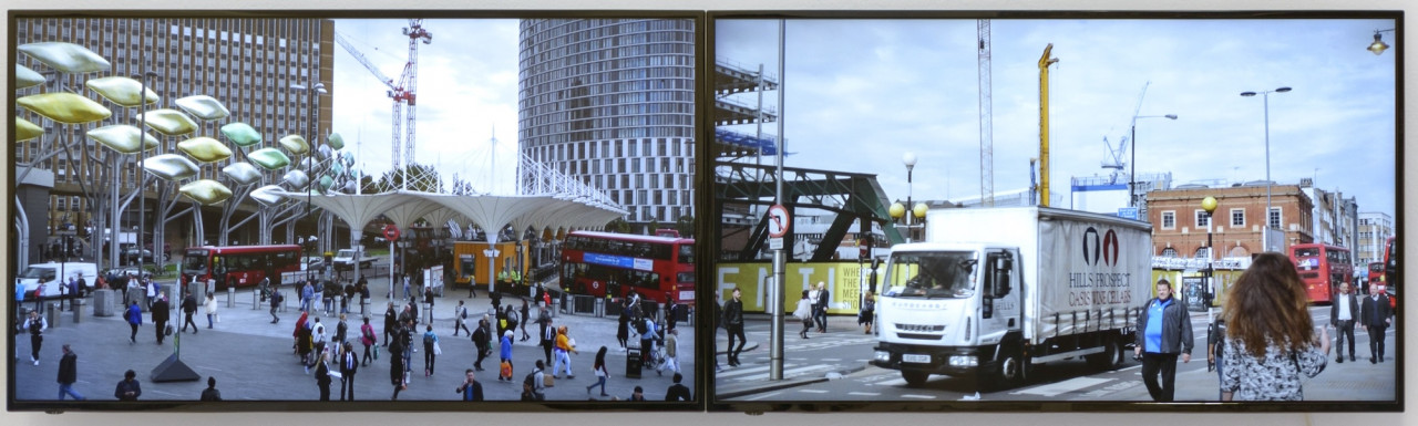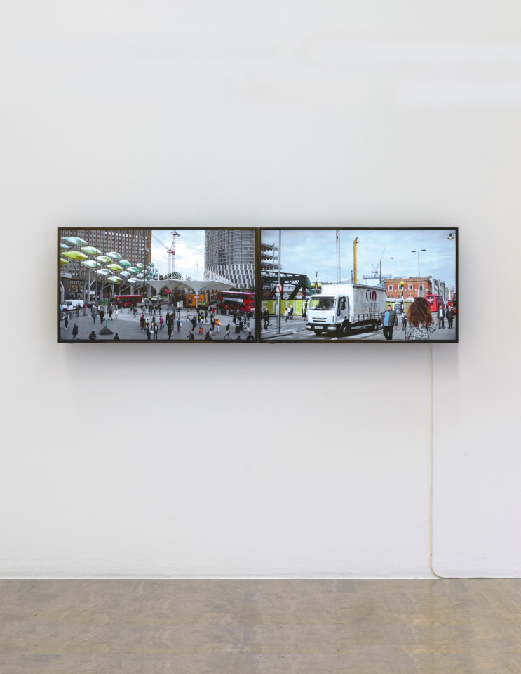 « Un bâtiment en verre déjà présent sur les photographies réapparaît dans le dyptique vidéo de City Scape diffusé sur des moniteurs accrochés au mur. Sur l’écran de gauche, du mobilier urbain décoratif attire l’attention. Un panoramique saisit la place, puis reproduit le même mouvement par un balayage optique plus rapproché. Ce mouvement entre en tension avec le plan fixe de l’autre écran, bien qu’il soit animé par une circulation urbaine intense. Cette activité économique a pour contrepoint la bande son d’une manifestation et les slogans qui rendent compte des problèmes du monde du travail. »