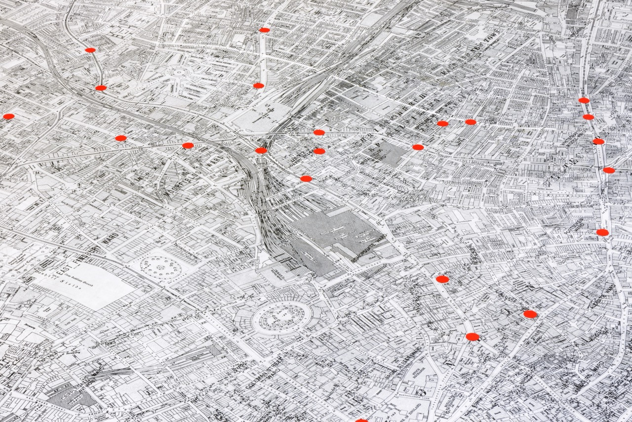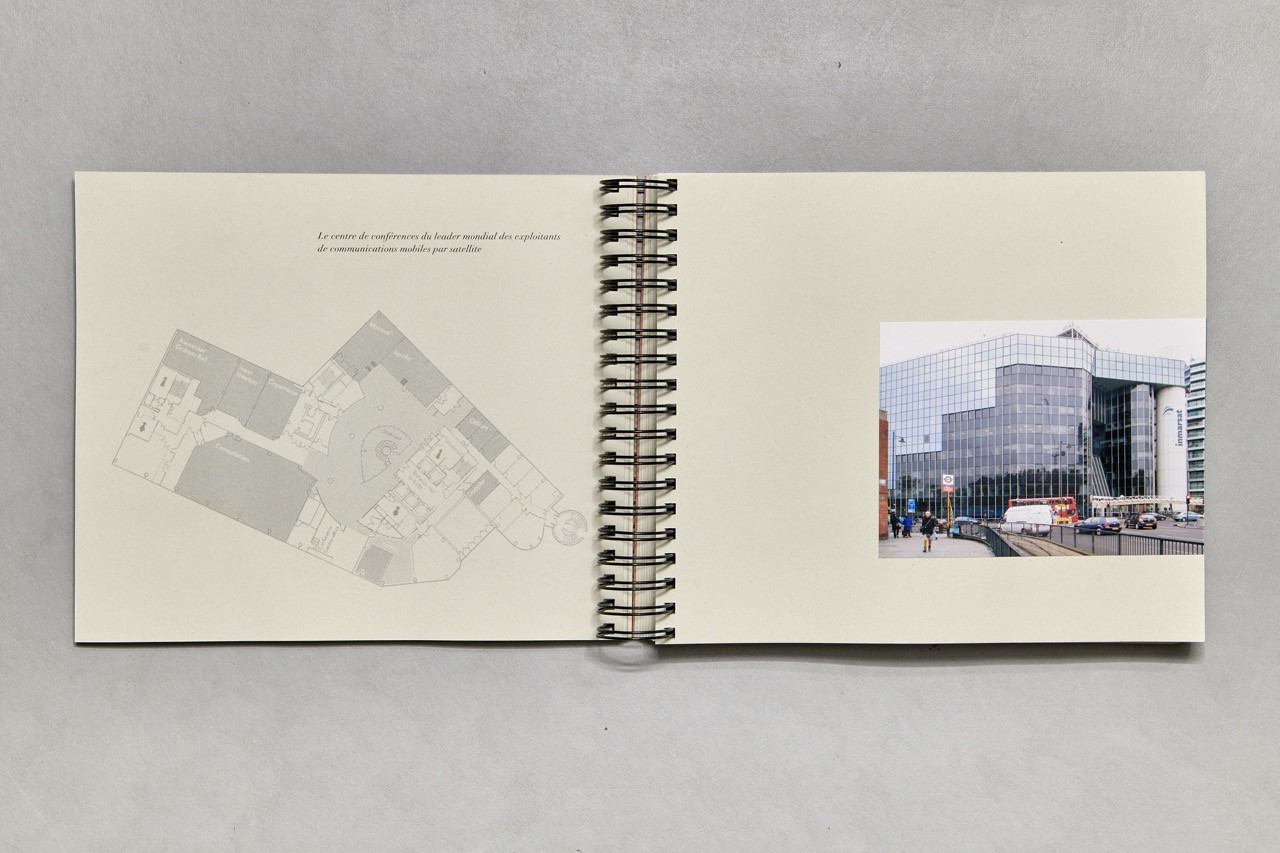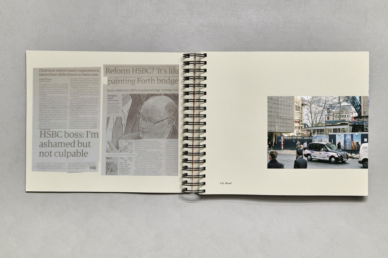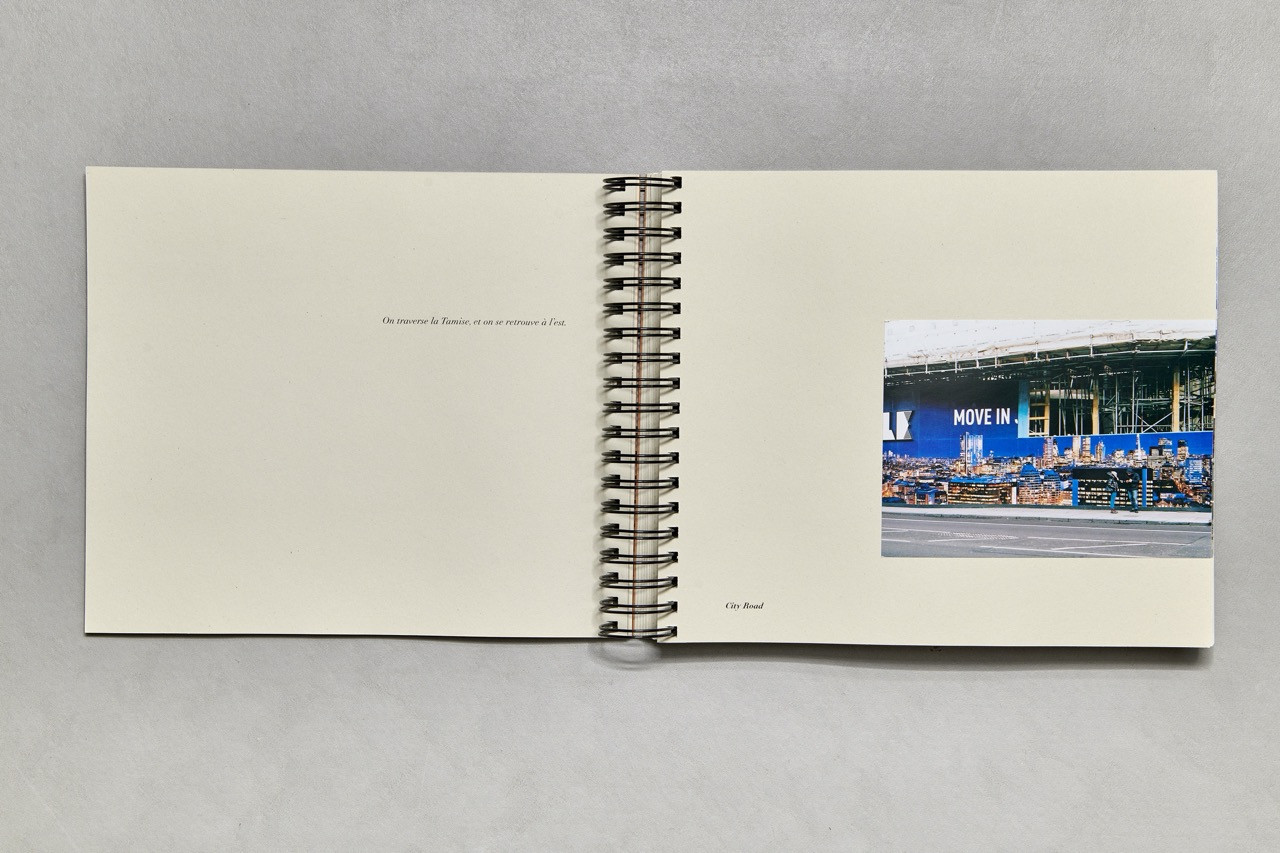 « La série de photographies d’Hidden Charms est présentée sous différentes formes. Dans le cahier d’artiste édité en deux exemplaires, les prises de vue sont séquencées comme un parcours discontinu et panoramique, entrecoupé de cartes et de textes tirés des recherches ou écrits par l’artiste. En ouverture de l’ouvrage, une première vue marque le contraste entre une série de bâtiments alignés, datés de la fin du 19ème, et le chantier d’une tour presque achevée. Son architecture imposante barre le ciel qui se trouve réduit à une bande marginale dans les images suivantes, oblitéré par l’imbrication d’infrastructures urbaines. Il est revanche miroité par les façades en verre, tout en produisant l’illusion d’une transparence. Déployée tant à l’horizontale qu’à la verticale, la saturation du territoire annonce une exploitation illimitée de l’espace.