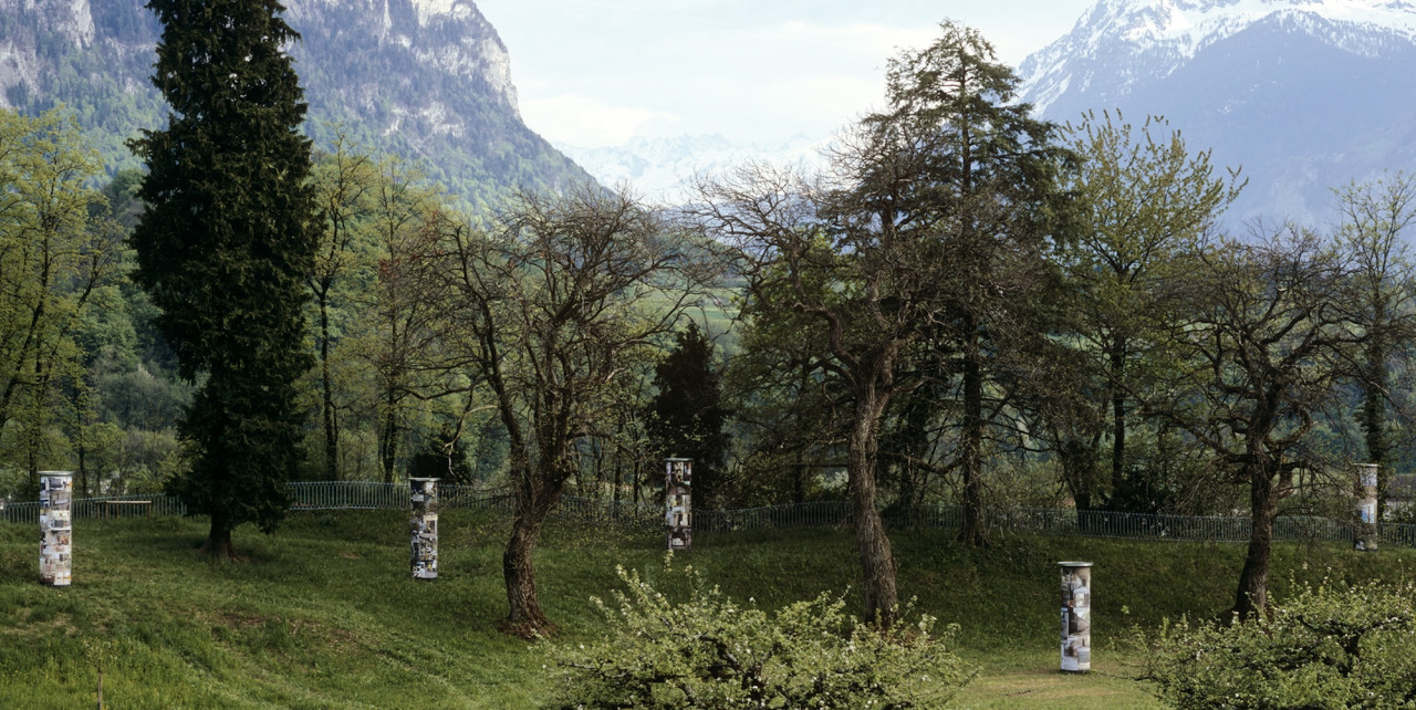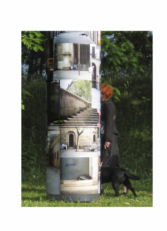 5 colonnes Morris sont disposées dans le parc, comme elles le seraient le long d’un boulevard. Ces éléments recouverts habituellement de publicités et d’affiches sont ici utilisés dans une optique différente. Ils servent en effet à mettre en évidence, dans un environnement naturel, ce que nous ne percevons plus dans l’environnement urbain, tels que les nettoyeurs des rues ou la police omniprésente. Les photographies prises lors d’un séjour de plusieurs mois à Barcelone, illustrent 5 thématiques spécifiques. Utilisant l’aspect attractif, monumental de ces colonnes, l’artiste nous place non pas face à un espace d’information, mais face à un espace de réflexion.