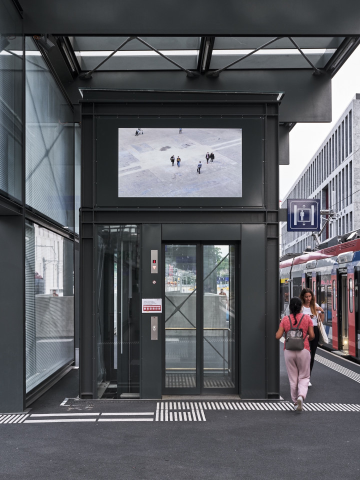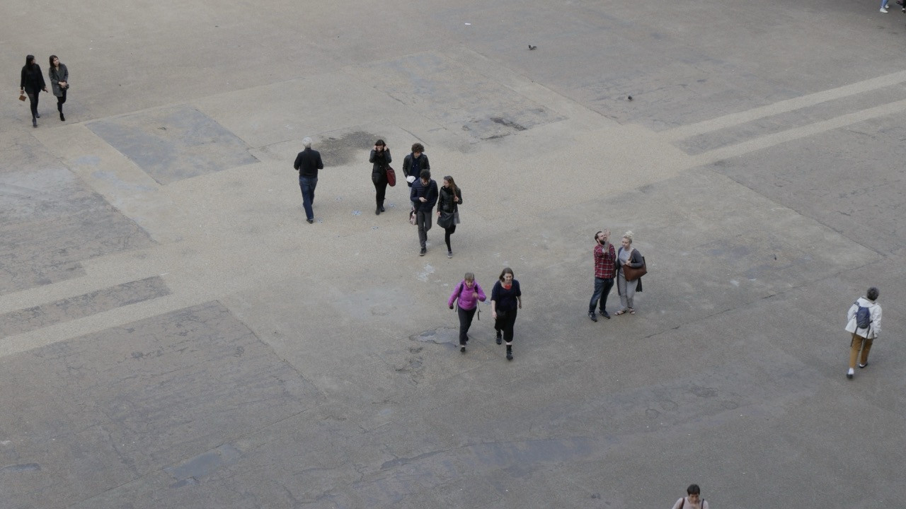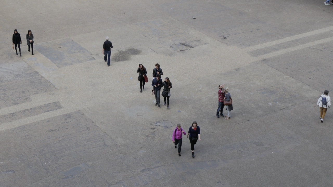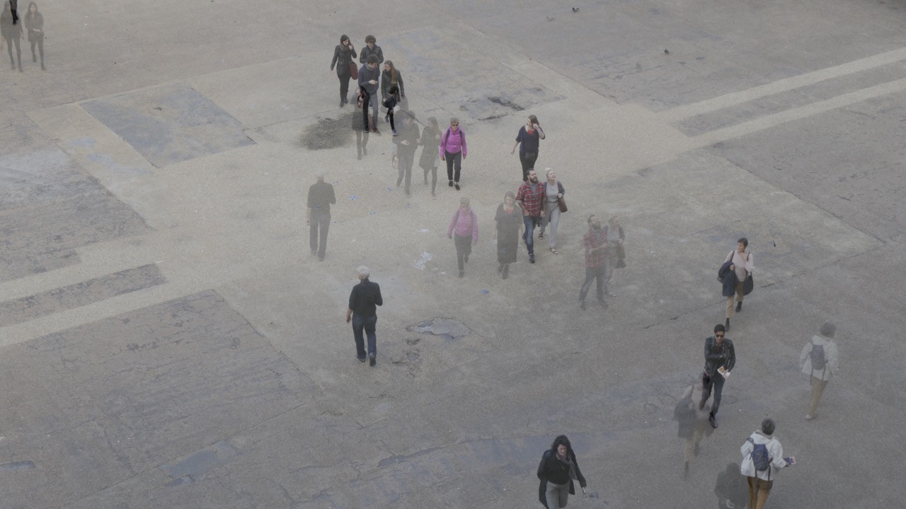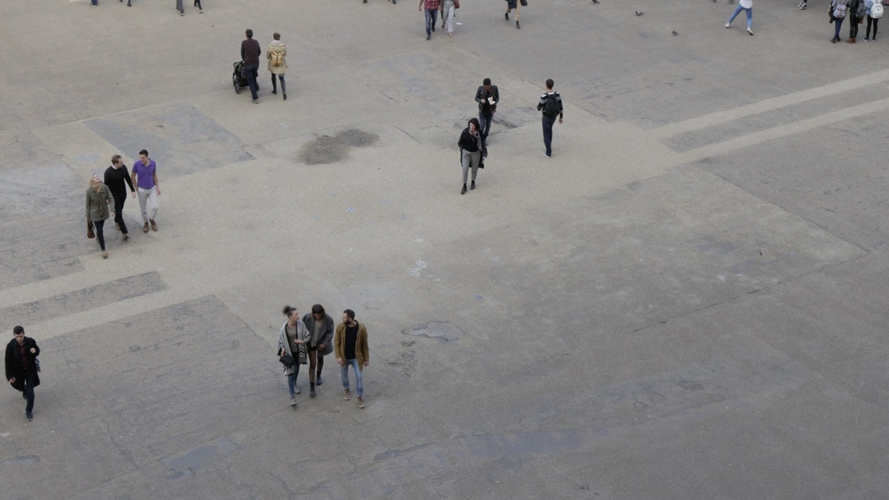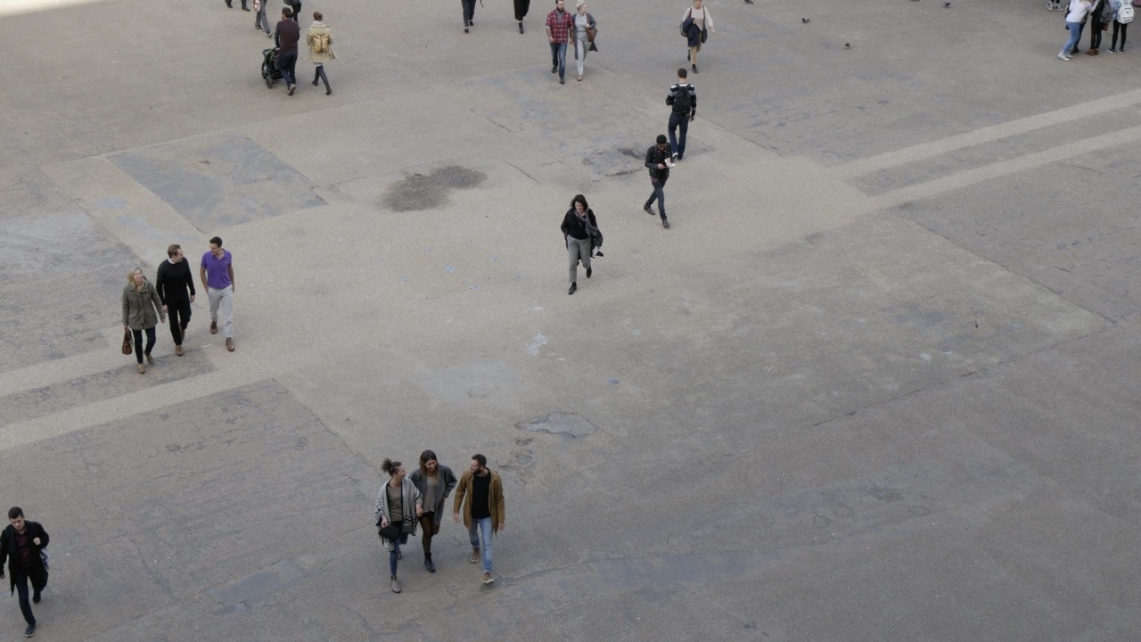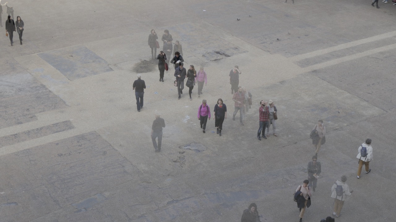 « Square (2019, vidéo, couleur, muet, 2 min) repose sur un autre processus de construction : le plan est fixe ; et il délimite strictement un espace (il n’y a pas de possibilité de hors-champ pour les passants filmés : lorsque que l’on quitte le cadre, on quitte la représentation, sans possibilité de retour). Dès lors, tout mouvement ne peut se déployer qu’à l’intérieur du champ, institué d’emblée et définitivement (peut-être arbitrairement ; en tout cas il contient et restreint la représentation). Square signifie une forme – le carré – et un espace public aménagé en tant que loisir – le square public. Conformément à l’énoncé de son titre, l’installation consiste en un plan fixe, filmé en forte plongée, et parcouru par des passants. Le sol, à travers l’angle de prise de vue, devient le lieu de la représentation, le motif de la bande. Conformément à la logique de la mise en abîme, il est possible de distinguer différents carrés au sein du sol qui est cadré par la caméra, et qui sert de support aux va-et-vient de personnes indifférenciées. Ce qui me paraît ici remarquable, c’est la conception de l’espace mise en jeu : ce n’est pas une grille qui se dessine, mais un damier dans un carré, à l’instar de Malevitch. Des personnes apparaissent, disparaissent, seules ou en groupe. Elles se meuvent selon leur propre volonté. Le principal procédé « intrusif » du film est le fondu enchaîné qui transforme l’espace de la représentation : comme dans les vues à truc de Méliès, les figures sont escamotées mais le cadre demeure fixe. En ce sens, Square tire profit, voire thématise, la construction même de l’image vidéographique : le montage a lieu à l’intérieur même du plan, et non dans le passage d’une vue à une autre ; la coupe étant interne au plan, le montage est reporté sur une dimension temporelle et non spatiale. Les embryons d’interaction – physique, sociale – qui pourraient apparaître entre les passants sont immédiatement interrompus par le procédé du fondu. En ce sens, par la technique de la vidéo, Square signifie encore une fois une dynamique qui est de l’ordre de la négation de l’interaction, les réseaux de communication remplaçant l’échange intersubjectif. »